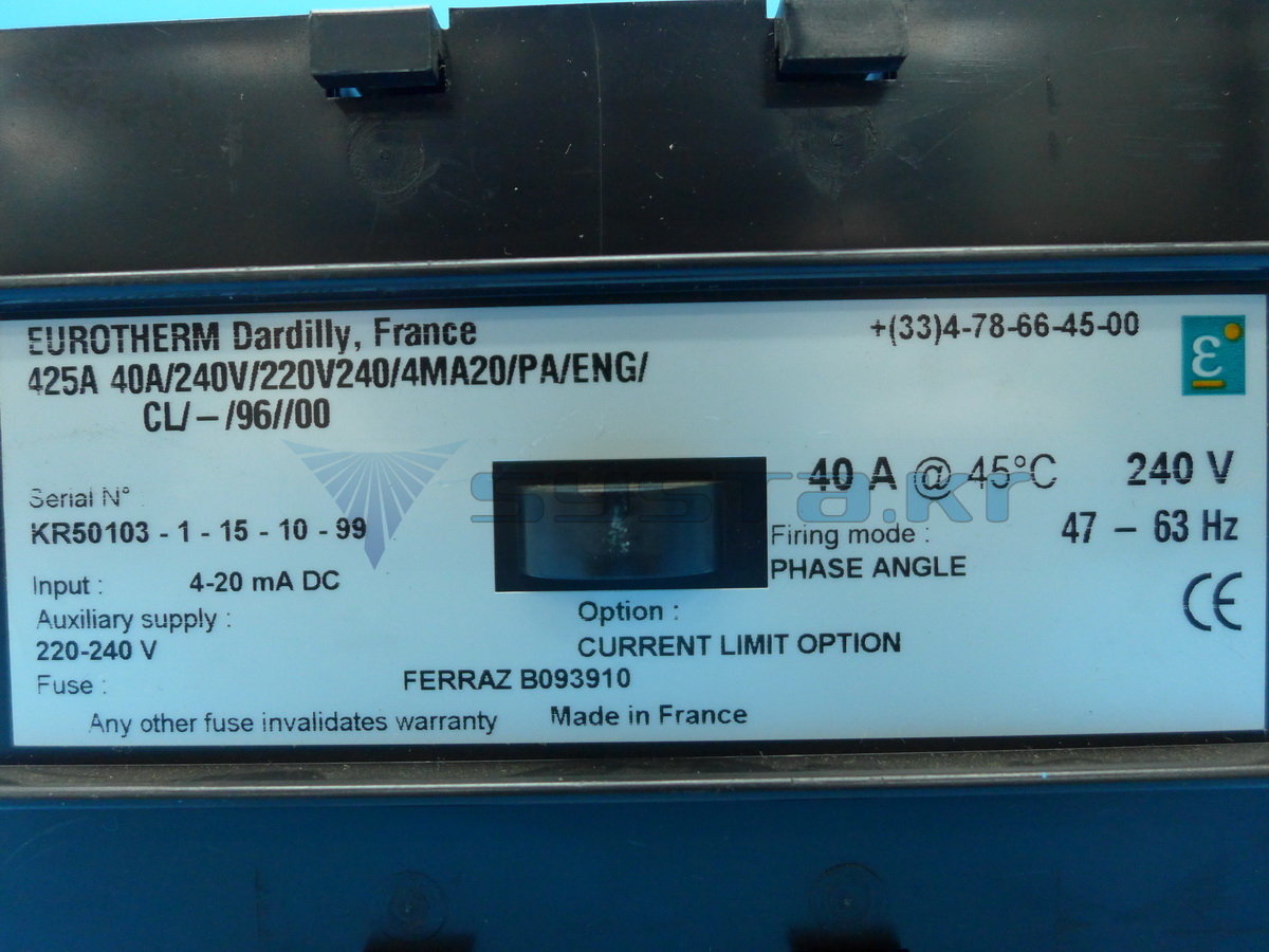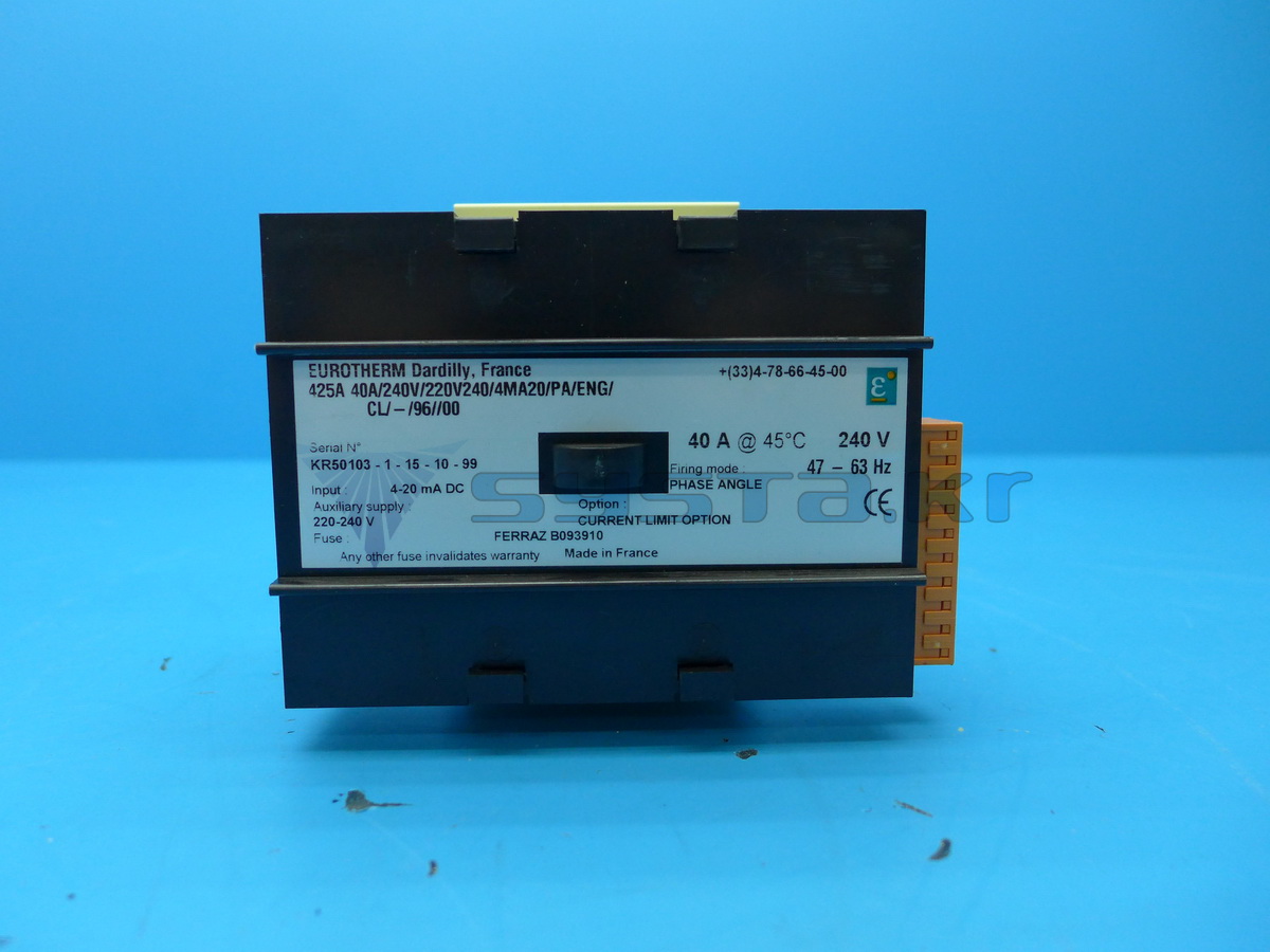 EUROTHERM SRC CONTROLLER 425A 40A/240V/220V240/4MA20/PA/ENG/CL/-/96//00 INPUT : 4-20mA DC 40 A@ 45C 240V, 47-63HZ MADE IN FRANCE , , Net dimensions and weight , 160*140*120mm / 1.3kg