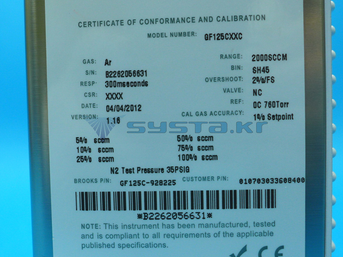 BROOKS GF125C-928225, GF Series Thermal Mass Flow Gas : Ar, Range ; 2000 SCCM