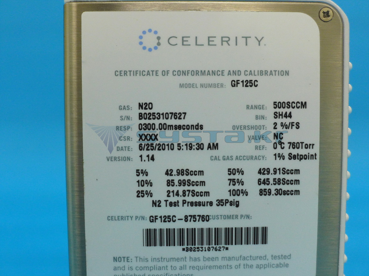 CELERITY GF125C, P/N : GF125C-875760 GAS : N2O, RANGE ; 500 SCCM