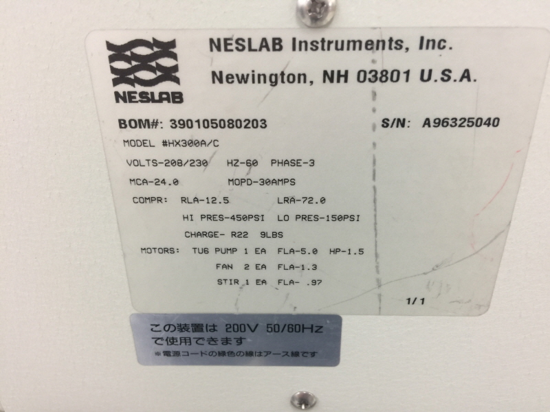 NESLAB HX300 Chiller , , Model : HX300A/C , Volts : 208/230 60HZ 3Phase , MCA-24.0 MOPD-30AMPS , COMPR : RLA-12.5 LRA-72.0 , HI PRES-450 PSI LO PRES-150PSI , CHARGE - R22 9LBS ,